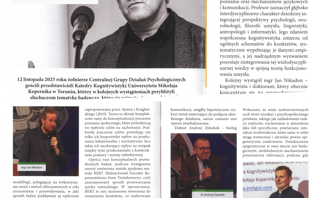 W naszych wykładach i rozmowach z przedstawicielami Centralnej Grupy Działań Psychologicznych, a także Dowódcami Centrum Szkolenia Sił Zbrojnych RP, staraliśmy się pokazać, jak elitarnymi i interdyscyplinarnymi zagadnieniami zajmujemy się w naszych badaniach, jak zaawansowane są nasze badania nad umysłem społecznych, językiem, sieciami społecznymi, mózgiem, psychiką i procesami biologicznymi. Opis naszej wizyty znalazł się branżowym czasopiśmie Centralnej Grupy Działań Psychologicznych „Czarny Pająk”.